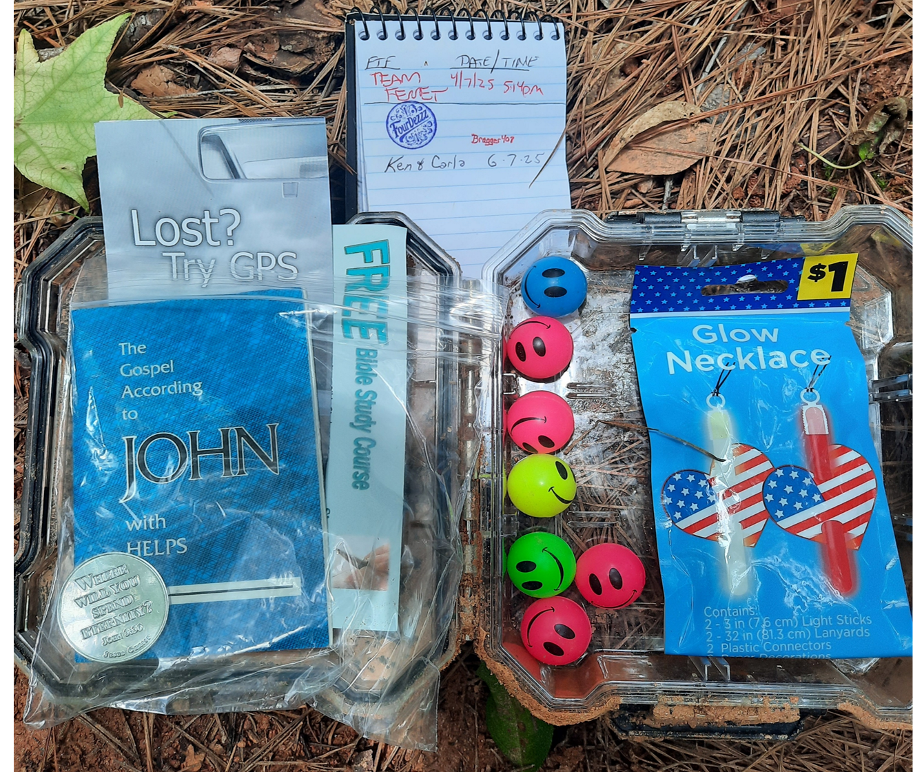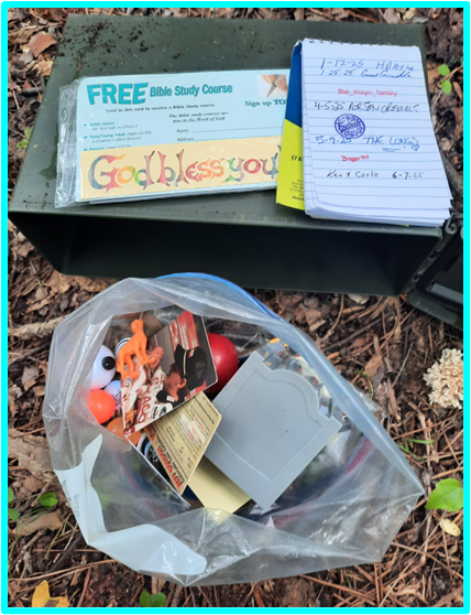 We enjoy getting outside and hiking, so we have been doing Geocaching as a Ministry. We find Geocaches where we can place items in them to hopefully point others to Jesus. Some pictures of cache finds and what we leave.